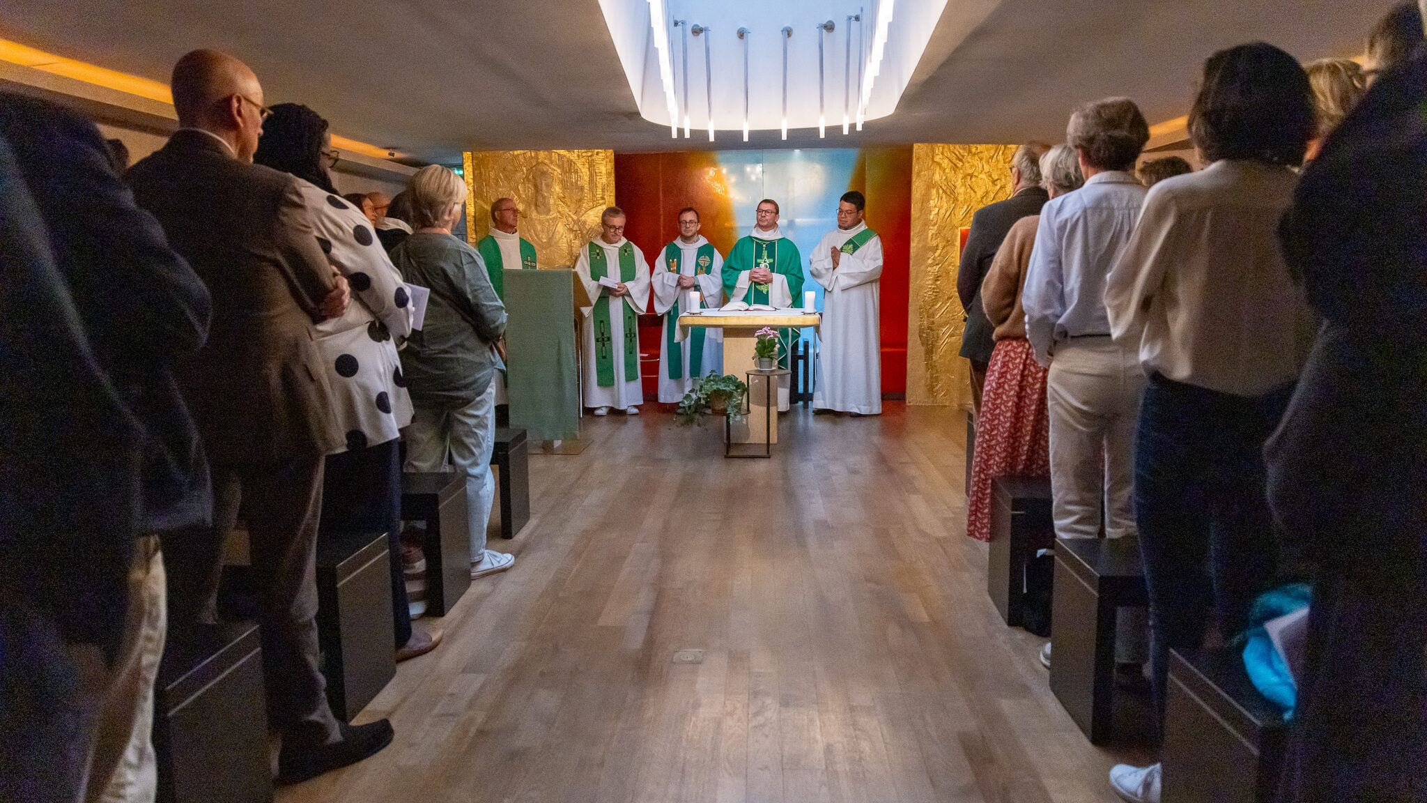 Pendant l’Évangile, point culminant de la liturgie de la Parole, l’assemblée se lève par respect.
